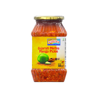 Ashoka's Gujarati Methia Mango Pickle delivers authentic regional flavour in a 500g jar. This traditional pickle combines raw mango with fenugreek seeds, mustard, and aromatic spices, creating a distinctive tangy and slightly bitter profile characteristic of Gujarati cuisine. The methia (fenugreek) seeds add a unique herbaceous note that sets this pickle apart from standard varieties. Perfect as a condiment with rice, bread, or curries, it enhances meals with genuine homemade taste. Store in a cool place and use a clean spoon to maintain freshness. An essential addition to any Indian kitchen.