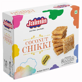 Jaimin Coconut Chikki (150g) - Jaimin's Scrumptious Coconut squares are sweet and crunchy, made with coconut flakes and sugar for that sweet and crunchy combination. Jaimin wraps every piece individually for your hygiene and convenience. Enjoy them now alongside your tea or warm beverage!