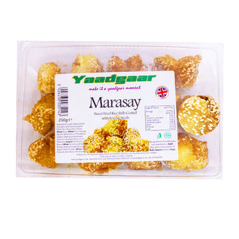 Discover a unique and delicious treat with Yaadgaar Marasay - 250g. These sweet rice balls are coated with sesame seeds, adding a satisfying crunch to each bite. Indulge in a flavorful experience with 100% natural ingredients. Satisfy your cravings with every bite.