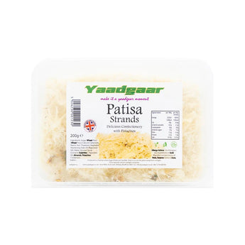 Yaadgaar Patisa Strands (200g), is a delicious confectionery with pistachios. Flaky, sweet and crispy this makes an amazing snack when craving you are craving sugar!