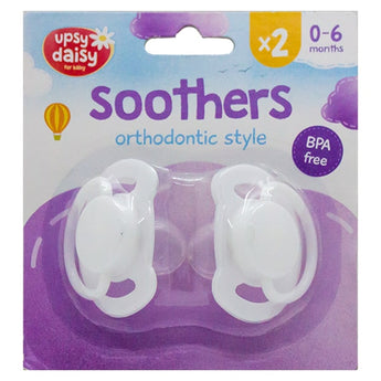 Upsy Daisy Silicone Soothers (100g) contains 2 silicone soothers for you baby. Suitable for babies from 0-6 months, BPA Free. The orthodontic style is a perfect fit for the baby's mouth, and won't cause any irritation.