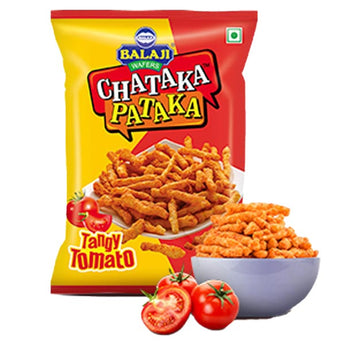 Balaji Chataka Pataka Tangy Tomato (65g). Spicy rice & corn tangy tomato sticks from Balaji Wafers. The pure bliss of spicy Indian masala shakes things up a bit.