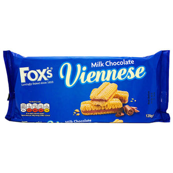 Fox's Viennese Milk Chocolate (120g)  , luxurious buttery biscuits with a chocolate centre. Perfect to have with tea, coffee or hot chocolate.