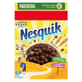Nestle Nesquik (375g). Delicious whole grain chocolate balls to start your day. Fortified Mixed fiber from 5 Whole Grain vitamins B3, B5, B6, iron, and minerals Cereal. It is important to have a varied and balanced diet as part of a healthy lifestyle.