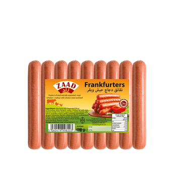 Zaad Beef Frankfurters (400g). 100% halal beef. Perfect for sandwiches and appetisers, for all the family. Full of flavour and real meat just for you.