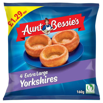 Aunt Bessie's 4 Extra Large Yorkshires (160g). Aunt Bessie’s extra large Yorkshire puddings: more room, more ideas, more meals. Made with the same tried and true recipe, our larger than ever frozen Yorkshire puddings are the ultimate all-rounders. Just pop them in your oven for 5 minutes, and the rest is up to you. Yorkshire pudding burgers? Quick and easy fruit tarts? Stranger things have happened.