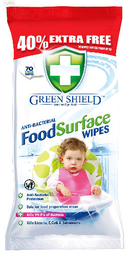 Greenshield food surface wipes cleaning 70 wipes For anti-bacterial protection, kills 99.9 percent of bacteria. Kills listeria, e. coli and salmonella.