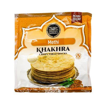 Heera Methi Khakhra (180g). Khakhara’s are thin crackers made from wheat flour and oil. It is served usually during breakfast. khakhra’s are uniquely hand-made and roasted to provide a delicious, crunchy and healthy snack enjoyed with a selection of pickles and chutneys.
