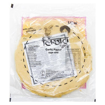 Lijjat Garlic Papad (200g). These round wafers, also known as poppadoms, consist of urad flour. They are rolled paper-thin, and dried out in the sun. In North India, papads are flame-roasted by placing it on a metal rack, a few inches above a burner. Once exposed to the heat, they will expand. Move the papad around quickly and evenly so it won't burn. Repeat to other side. In the South, they are deep fried in oil. Once in hot oil, they will expand and sizzle. Remove with tongs and place on paper towel to remove excess oil. Papads are served as an appetizer with coriander chutney, or served as an accompaniment to biryanis, pulaos and curries.