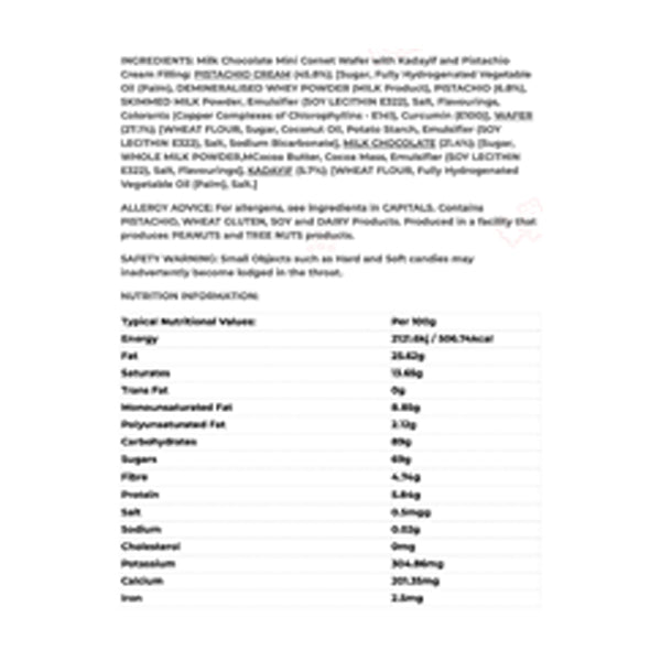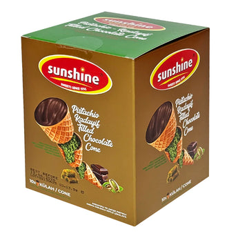 Indulge in the rich fusion of textures and flavours with the Sunshine Pistachio Kadayif Filled Chocolate Cone. Combines delicate, crispy kadayif pastry with a luxurious pistachio filling, all encased in premium chocolate. Each cone features crisp, kadayif pastry filled with smooth pistachio cream, Filled with rich, high-quality chocolate. This expertly crafted combination offers a sophisticated balance of textures and tastes, perfect for gourmet snacking or elegant entertaining.