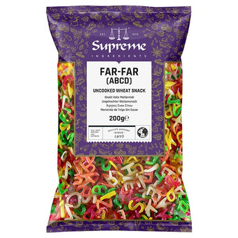 Supreme Far-Far (ABCD) (200g) is a uncooked wheat snack ready to go for all your snack needs. Just open the pack and start frying to a get a colourful, alphabet shaped Indian snack. Perfect for the friends and family, ideal for sharing with guests during celebrations.