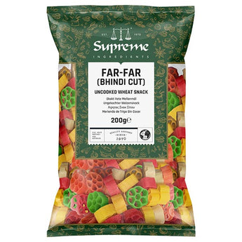Supreme Far-Far (Bhindi Cut - 200g), is an uncooked wheat snack ready to go for all your snack needs. Just open the pack and start frying to a get a colourful, shaped Indian snack. Perfect for the friends and family, ideal for sharing with guests during celebrations.