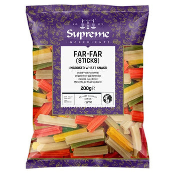 Supreme Far-Far (Sticks) (200g) is a uncooked wheat snack ready to go for all your snack needs. Just open the pack and start frying to a get a colourful, sticks shaped Indian snack. Perfect for the friends and family, ideal for sharing with guests during celebrations.