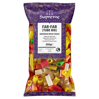 Supreme Far-Far (Tube Big) (200g) is an uncooked wheat snack ready to go for all your snack needs. Just open the pack and start frying to a get a colourful, shaped Indian snack. Perfect for the friends and family, ideal for sharing with guests during celebrations.