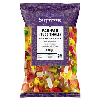 Supreme Far-Far (Tube - Small) (200g) is an uncooked wheat snack ready to go for all your snack needs. Just open the pack and start frying to a get a colourful, shaped Indian snack. Perfect for the friends and family, ideal for sharing with guests during celebrations.