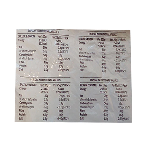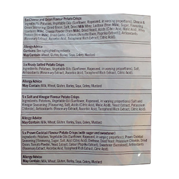 x5 Cheese Onion, x5 Ready Salted, x5 Salt & Vinegar, x5 Prawn Cocktail