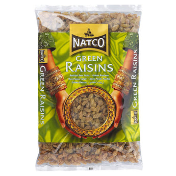Natco Green Raisins (700g) Green raisins are softer and slightly juicier than darker, brown raisins. They are often used in Indian cuisine in sweet dishes such as rice pudding, and they go very well with cardamom and rose water. Try using them in savoury dishes too, scatter the green raisins over wilted greens with pine nuts, or mix through a pile of fluffy rice with herbs and spices.