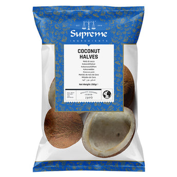 Supreme Coconut Halves (250g), a pack of pre-cut, halved, dried coconuts for your cravings. They are ready to go, whether it be for snacking or for culinary needs, supreme coconut halves will do the job!