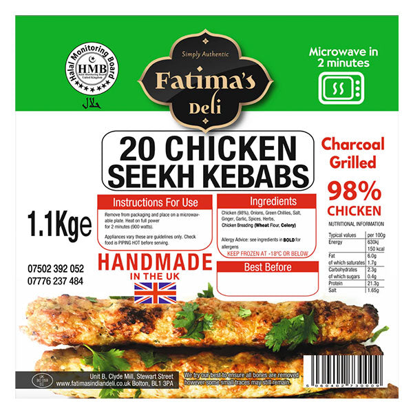 Fatima's Deli 20 Chicken Seekh Kebabs offer a convenient and authentic way to enjoy flavorful, spiced chicken kebabs at home. Weighing 1.1kg, this pack contains 20 individually shaped kebabs, perfect for grilling or pan-frying. Crafted with quality ingredients, these kebabs deliver a balanced blend of spices and tender chicken, making them ideal for gatherings or quick meals. Their consistent size ensures even cooking, providing a delicious and satisfying experience every time.