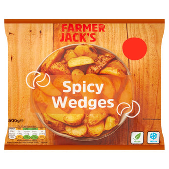 Farmer Jacks Spicy Wedges (500g). Frozen spicy wedges ready to be cooked and added as a delicious side with many meals.