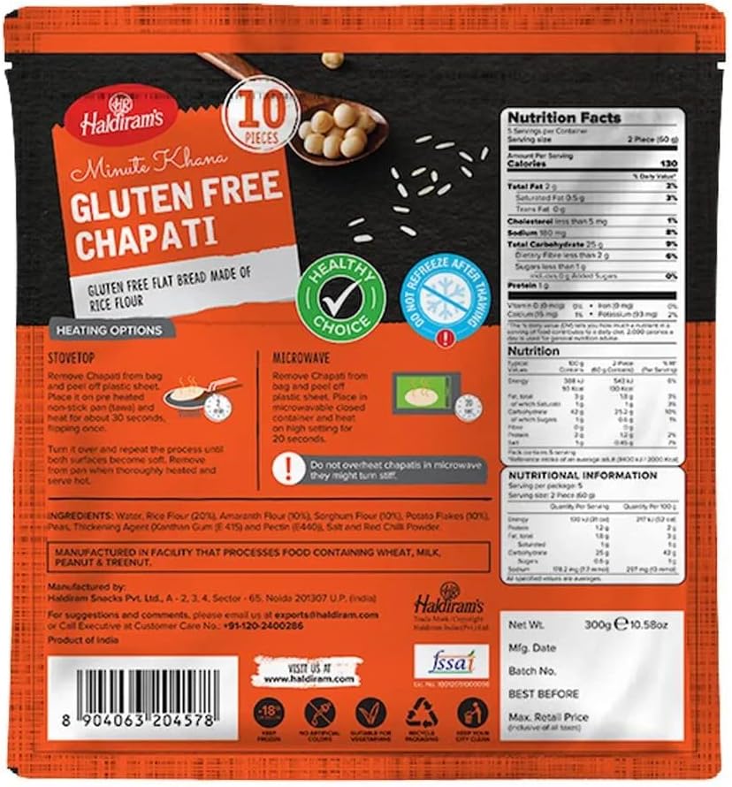 Haldiram's Gluten Free Chapati (300g), Introducing Haldiram's Gluten Free Chapati, a ready to eat roti made from 100% natural ingredients. This frozen roti is an easy and convenient way to enjoy a traditional roti without having to make it from scratch. Plus, it is certified gluten-free, giving you peace of mind when you serve it to your family and friends.