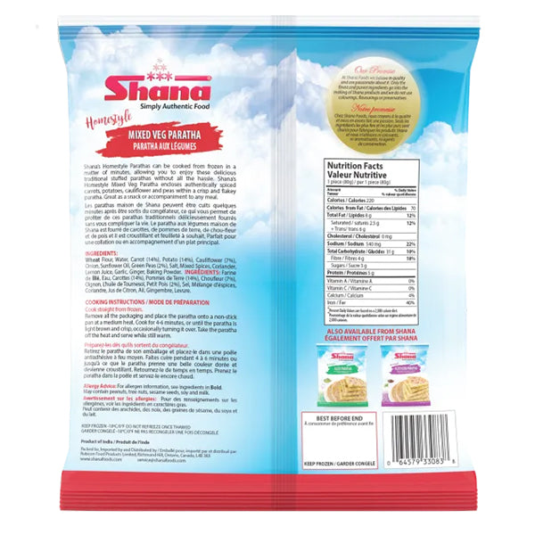 With Shana Homestyle Mixed Veg Parathas, enjoy a delicious blend of mixed vegetables in every bite. Made with authentic Indian spices, these 400g parathas are perfect for a quick and hearty meal. Indulge in the flavors of India with every taste.