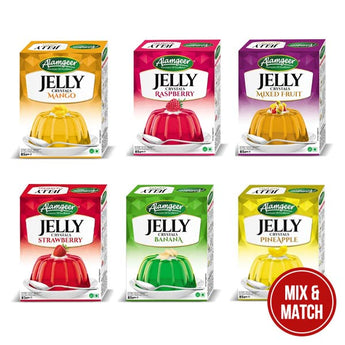 Alamgeer Jelly Crystals Mix & Match OFFER 2 For £1. Delicious fruit flavoured crystal jellies--quick and easy to make. 100% halal.