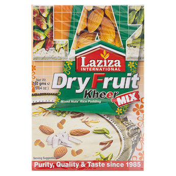 Laziza Dry Fruit Kheer Mix (160g) pudding is a sweet delicacy from the Indian Subcontinent made by boiling milk with sugar consisting of processed rice, dry dates, pistachios, almonds, coconut, cardamom, pine essence, etc.