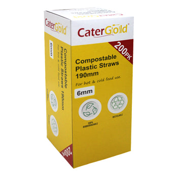 Expertly crafted for the catering industry, our Cater Gold Compostable Plastic Straws are the perfect eco-friendly solution. Measuring 190*6mm and coming in a pack of 200, they provide convenience and sustainability in one. Made from plant-based materials, they are 100% compostable without sacrificing durability. Upgrade your beverage service with confidence.