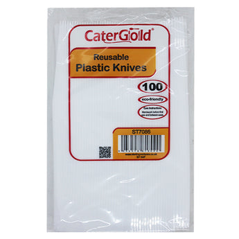 Introducing Cater Gold Reusable White Plastic Knives 100pk, the perfect solution for all your catering needs. Made from durable plastic, these knives offer reliable strength for any event. Save money and reduce waste with this reusable pack of 100 knives. Professional, efficient, and eco-friendly - the perfect choice for any expert caterer.