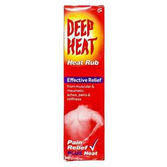 Deep Heat Rub (35g) is a non-greasy pain relieving cream. The penetrating warmth of Deep Heat rub helps stimulate circulation, relax stiffness and reoxygenate tense, painful tissues. Deep Heat rub provides fast, effective relief from muscular pain and stiffness, backache, sciatica, lumbago, fibrositis, rheumatic pain, bruises, chilblains, minor sports injuries and sprains.