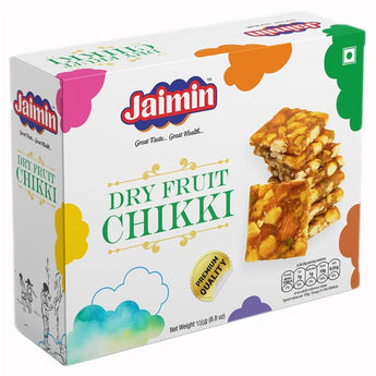 Jaimin Dryfruit Chikki (100g). Jaimin Snacks presents sweet tasty Indian delights made from peanuts, sesame and other ingredients moulded in thick Jaggery.