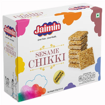 Jaimin Sesame Chikki (200g), this is a Vegetarian product. Crispy and crunchy Less sweet Made from pure sesame seed and jaggery.