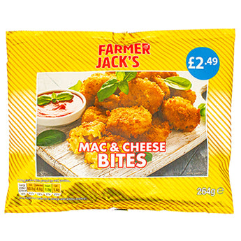 Farmer Jacks Mac N Cheese Bites (264g). Mac and Cheese bites coated in breadcrumbs. Suitable for Vegetarians, A convenient and delicious way to enjoy a classic comfort food favorite. These bite-sized snacks feature a crispy outer coating with a creamy, cheesy macaroni filling inside, perfect for sharing or as a satisfying snack on the go. Ideal for quick meals or party platters, they combine rich flavours with easy preparation, making them an expert choice for those seeking quality and taste in a ready-to-eat snack.