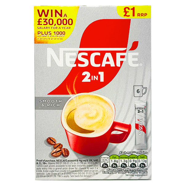 Nescafé 2 in 1 Coffee 6pk combines smooth coffee and creamer in one easy-to-use sachet, providing a balanced and creamy flavour without added sugar. Each pack includes six individual servings, perfect for a quick, high-quality coffee anytime, whether at home, work, or on the move. This product delivers convenience without compromising taste, making it an excellent choice for coffee lovers seeking simplicity and consistency.