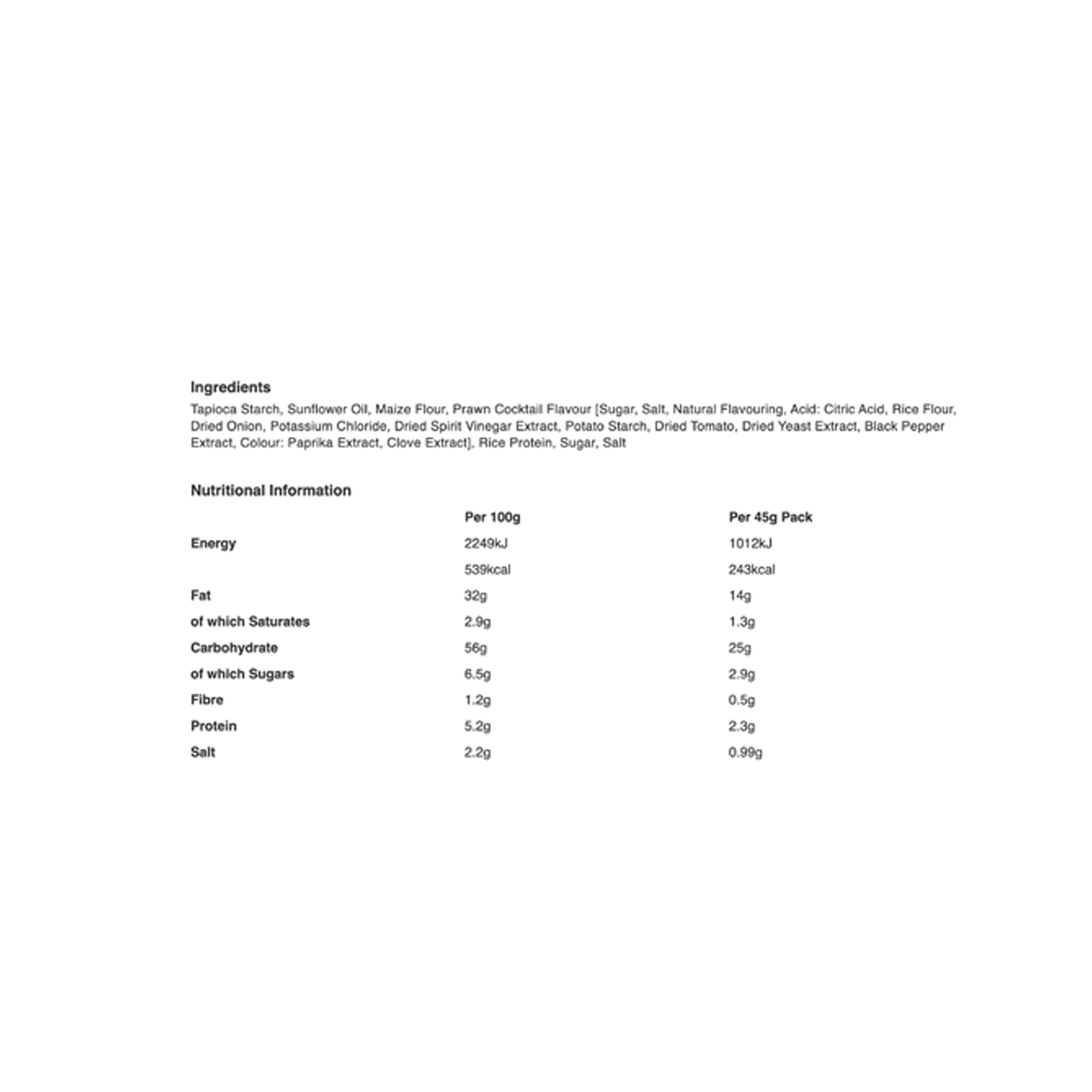 Skips Prawn Cocktail 45g crisps deliver a light and crunchy texture combined with a distinctive prawn cocktail flavour profile. Perfect for those who appreciate a balanced tangy and savory snack, these crisps offer an enjoyable, satisfying bite in a convenient single-serve pack. Ideal for on-the-go enjoyment or lighter snacking moments.