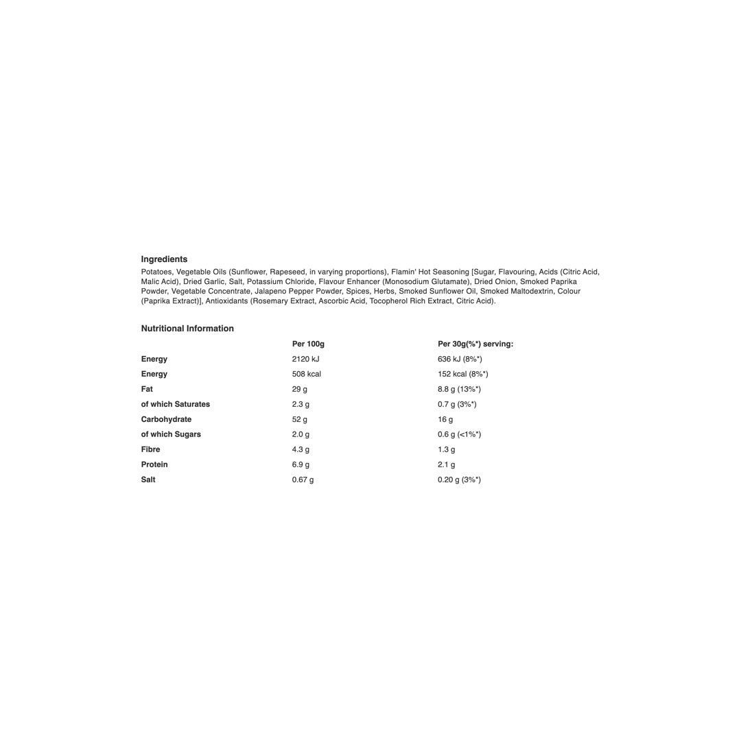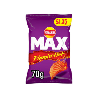 Walkers Max Flamin Hot delivers intense heat and bold flavour in every bite. These 70g bags pack a serious punch with a fiery chilli kick that builds throughout, appealing to those who crave genuine spice rather than mild alternatives. The thick-cut corn snack base provides satisfying crunch and texture, while the seasoning coating ensures consistent flavour distribution. Perfect for heat enthusiasts seeking a premium crisp experience that doesn't compromise on taste. Stock up on these popular crisps for snacking or sharing with fellow spice lovers.
