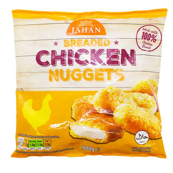 Jahan Breaded Chicken Nuggets (500g). Breaded chicken nuggets made with 100% chicken breast coated in a delicious crunchy breading.