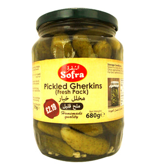 This 680g jar of Sofra Pickled Gherkins offers a tangy and flavorful addition to any meal. Made with quality ingredients, these gherkins are pickled to perfection and offer a delicious crunch. With a generous amount in each jar, you'll have plenty to enjoy as a snack or to add to your favorite dishes.