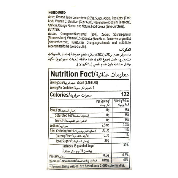 Shezan Orange Juice delivers refreshing citrus flavor in a convenient pack of six 250ml bottles. Made from quality oranges, this juice provides a burst of vitamin C and natural goodness. Perfect for lunchboxes, quick refreshment, or as a nutritious breakfast companion. Enjoy the authentic taste of oranges in every sip.