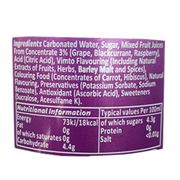 Satisfy your thirst with Vimto Sparkling Can 330ml! Made with a blend of grapes, raspberries, blackcurrants, and herbs, this refreshing drink is perfect for any occasion. With a balanced mix of sweetness and tanginess, it's a delicious and fizzy way to stay hydrated. Try it now!