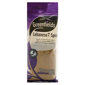 Greenfields Lebanese 7 Spice (75g). A warm, rich blend of seven spices giving an authentic Middle Eastern flavour to beef, chicken or lamb dishes.