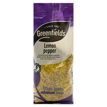 Greenfields Lemon Pepper, an instantly zesty, peppery coating for chicken and fish. Mix with breadcrumbs to create a more mellow flavour.