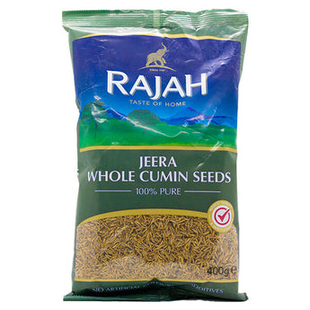 Rajah Jeera Whole Cumin Seeds (400g) is the dried ripe seed of the cumin plant and has a strong aroma and an earthy, warming flavour.