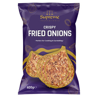 Supreme Fried Onions (400g), are ready to Use! 100% natural, no artificial colourings or flavourings. Add flavour and crunch to your dishes - sprinkle on top of dals, curries and rice dishes.
