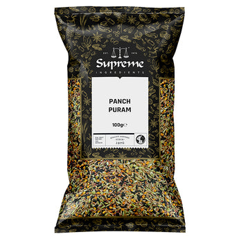 Supreme Panch Puran (100g) Mix of five spices, perfect for adding flavour in any curries, dhals etc. Panch puran consists of fenugreek seed, nigella seed, cumin seed, black mustard seed and fennel seed in equal parts.