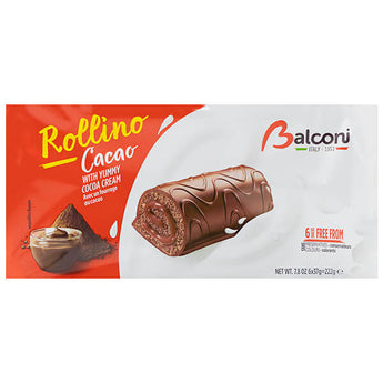 Balconi Rollino Cacao With Yummy Cocoa Cream (222g). Rollino Cacao is the perfect choice for a delicious, quality snack. Yummy cocoa cream wrapped in a warm cocoa coated sponge cake.