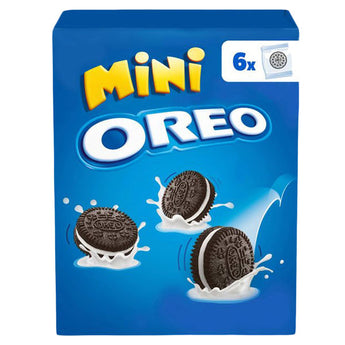 Oreo Mini Box 6pk (114g).   The mini Oreo is a tasty chocolatey sandwich biscuit filled with a creamy vanilla flavour centre. Ideal for lunchboxes. Suitable for Vegetarians.