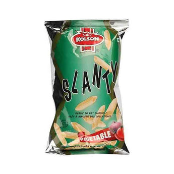 Kolson Slanty Chips Vegetable (60g). A popular savory snack from Pakistan! Slanty crisps are well known for their tasty flavours and their crispy crunch! Try this vegetable flavoured crunchy crisp.