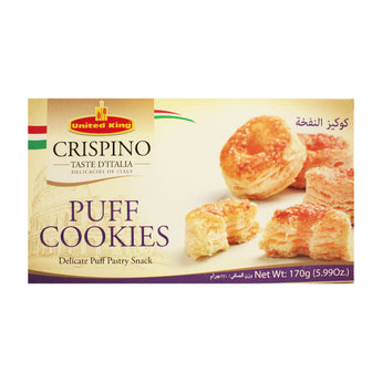 Introducing United King Crispino Puff Cookies 170g - deliciously crunchy and fluffy cookies perfect for snacking. Made with quality ingredients and baked to perfection, these cookies will satisfy your cravings. Enjoy the rich flavor and texture of these indulgent treats.